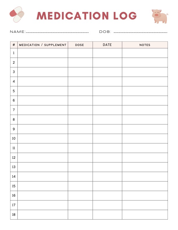 This easy-to-use medication log helps you track your pig’s worming schedule, vaccinations, and any treatments — all in one place. Stay organized, reduce stress, and ensure your pig gets the care they need, right on time.