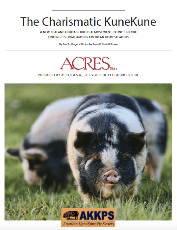 In the above downloadable PDF from the American KuneKune Pig Society, you will learn the basics about the KuneKune breed of pigs.